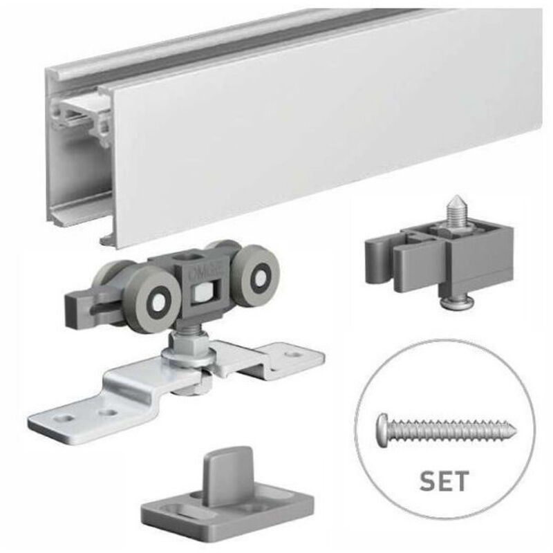 Sistema scorrevole per porte fino a 80 kg. profilo superiore in alluminio e carrelli in nylon a quattro ruote montate su cuscinetti a rulli con perno in acciaio, estremamente silenzioso e di facile montaggio, possibilit? di montaggio a soffitto o a parete