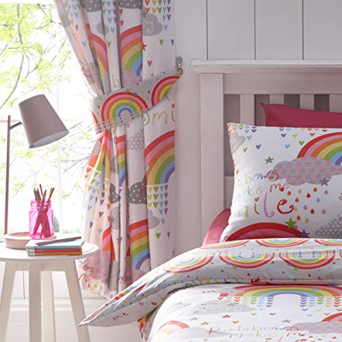 Illumina la tua camera da letto con queste tende colorate a tema nuvole e arcobaleno. Con arcobaleni, nuvole e stelle tutte sapientemente intrecciate con citazioni ispirate in un carattere pastello, queste tende saranno sicuramente una grande aggiunta a qualsiasi camera da letto dei vostri più piccoli.
