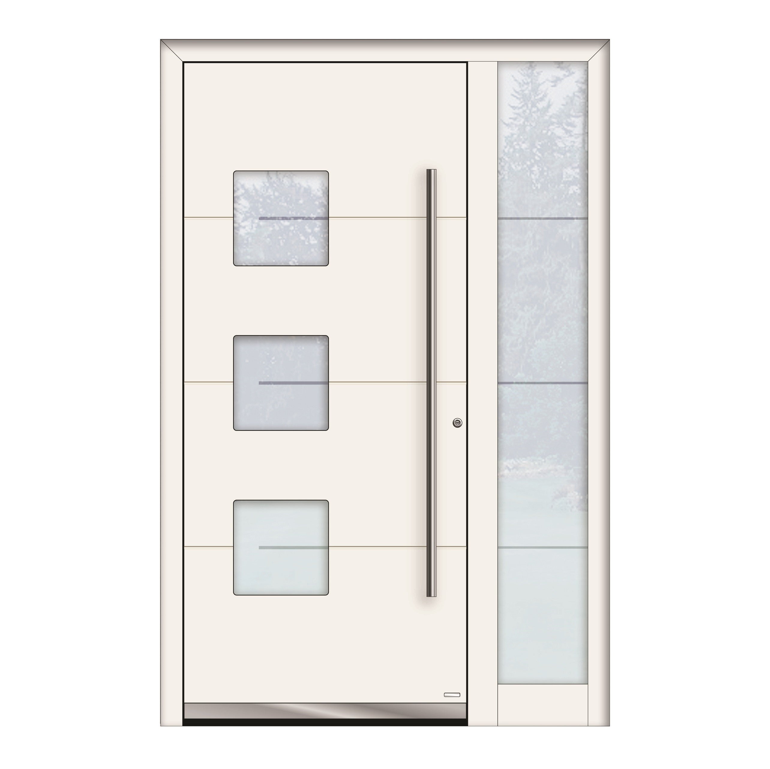 Questa combinazione gioiosa e giocosa data da tre finestrelle quadrate arricchisce una casa di per sé già felice. Per i giovani di spirito. L'elegante maniglione in acciaio inossidabile non fa altro che esaltarne lo splendore.. Porte di sicurezza solide per case, appartamenti, uffici e altro.. Questo è il settore di competenza in cui le porte Aurum brillano. Il loro spessore è addirittura di 8,7 cm, il che non offre solo una piacevole sensazione di sicurezza ma anche un'elevata protezione alle variazioni di temperatura.. Grazie all'incredibile isolamento termico Aurum si posiziona tra le porte adatte a case a basso consumo energetico. Il livello di sicurezza viene ulteriormente aumentato dalla serratura a tre punti con tre solidi ganci.. La robusta struttura in acciaio non richiede manutenzione per i prossimi decenni. È composta da profili in alluminio a 3 guarnizioni montati in modo impeccabile che creano un solido blocco monolitico.