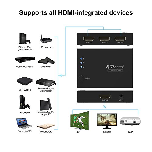 【Ampia Compatibilità】Portta switch hdmi funziona con tutti i dispositivi integrati hdmi come PS3 / PS4 / PS4 PRO / X-BOX uno / DVD / Blu-ray DVD / PC / Notebook Macbook STB Roku TV / Fire TV / Altri dispositivi Apple e Sony con porte hdmi.