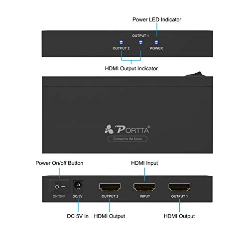 Portta HDMI Splitter Switch 4K, Interruttore HDCP Ultra HD Full HDR 4K @ 60HZ HDCP2.2 con 2 porte 1 ingresso 2 uscita HDMI 1x2 V2.0, Nero
