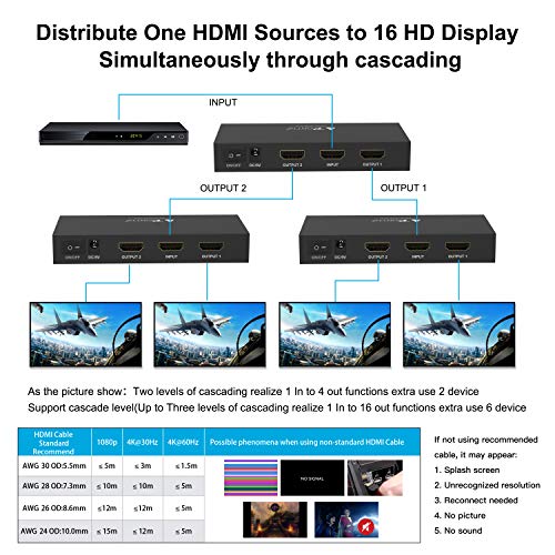 【HDMI Splitter Funzione】Supporta i formati audio 4K / 60Hz YUV 4: 4: 4, HDCP 2.2, HDR, FULL 3D,12bit per channel (36bit all channels)Deep Colour, non compresso (LPCM) e compresso (DTS, Dolby Digital: inclusi DTS-HD Master Audio e Dolby TrueHD)