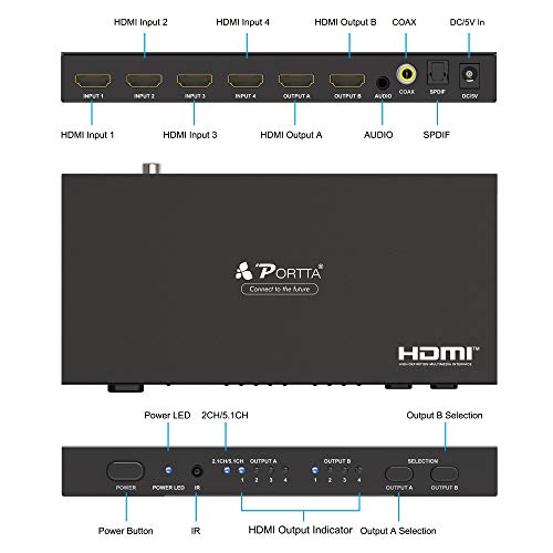 【Modalità 4 in 2 out】 HDMI Matrix Switch consente di condividere fino a 4 ingressi HDMI distinti con audio tra 2 dispositivi di uscita indipendenti e di commutare tramite telecomando o pulsante anteriore. Ingresso: HDMIx4, Uscita: HDMIx2, 3.5mm Stereox1, Coaxialx1, Toslinkx1. Nota: L'audio estratto di questo elemento è lo stesso dell'audio selezionato dall'uscita A. Solo la sorgente di uscita A selezionata ha l'uscita audio, l'ottica e il 3.5mm coassiale possono emettere lo stesso suono di quel