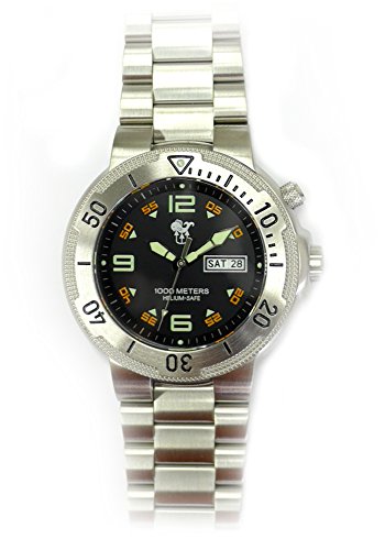 Helium Camera di stampa sicuro per viaggi Corona a 3 orologio posizione cassa acciaio vetro zaffiro alta ghiera per proteggere il vetro acciaio inossidabile cinturino Helium valvola ponte di larghezza 22 mm impermeabile fino a 1000 m Peso ca. 200 G diametro esterno 45 mm hoehe12 mm datario quadrante nero quadrante fluorescente