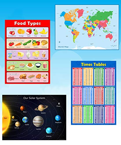 Tutto ciò di cui hai bisogno: per dare loro il primo inizio che meritano. Questa incredibile confezione di 18 poster educativi include: tabelle orarie, colori, bandiere, forme 2D e 3D, spazio, mappe del mondo, Telling the Time, The Human Body, Frazioni decimali e percentuali, la tavola periodica, tavoli di addizione, tavoli di sottrazione, tavoli di divisione, mappa continenti, mappa del Regno Unito, tipi di alimenti, altri modi per dire parole e la tabella di moltiplicazione.