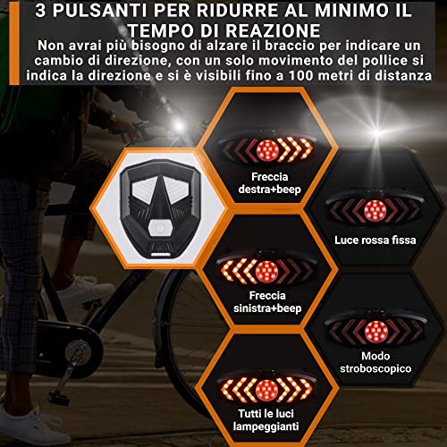 Luce Posteriore per Bici e Monopattino con Indicatori direzione e avviso acustico, Telecomando Wireless, Impermeabile, batteria Ricaricabile, Facile a Installare Sii Visibile e Mostra la tua Direzione