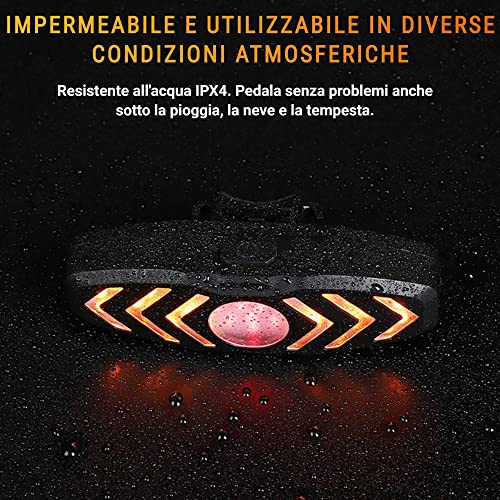 [ RICARICABILE E IMPERMEABILE ] Batteria ricaricabile ad alta capacità integrata, ricarica la tua luce posteriore con frecce via USB, semplice e veloce dal tuo computer o altri metodi di ricarica. Tutti i cavi sono inclusi. Pedala anche sotto la pioggia senza stress, il nostro sistema è resistente all'acqua