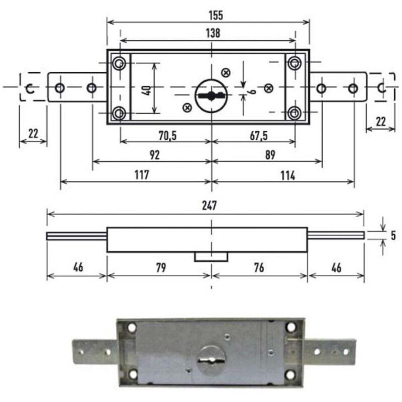 A doppia mappa. Per installazione centrale con catenacci dritti a 2 mandate. Corsa catenacci Mm. 22. Scatola in acciaio zincato da Mm. 155x56, spessore Mm. 18,5. In dotazione: 2 chiavi. A doppia mappa. Per installazione centrale con catenacci dritti a 2 mandate. Corsa catenacci Mm. 22. Scatola in acciaio zincato da Mm. 155x56, spessore Mm. 18,5. In dotazione: 2 chiavi.