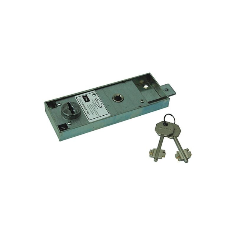 A doppia mappa. Verticale con chiusura singola lato superiore a 2 mandate. Corsa catenaccio Mm. 22. Quadro maniglia Mm. 8. Interasse Mm. 66. Scatola in acciaio zincato da Mm. 155x56, spessore Mm. 18,5. In dotazione: 2 chiavi.