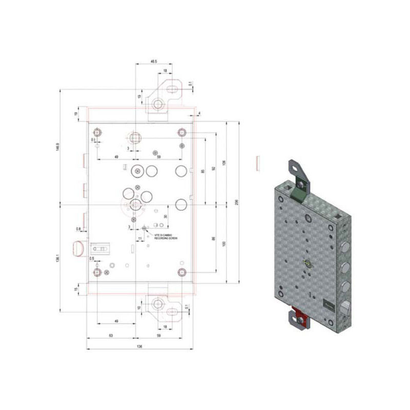 Serratura doppia mappa a planare 2 chiusure verticali Catenacci laterali 3 pistoni e scrocco Interasse catenacci mm 37 Scatola 136x206 - Entrata 63 3 chiavi + 1 chiave cantiere