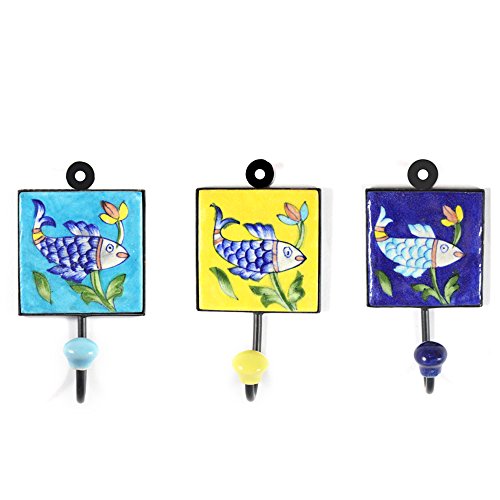 Blue Pottery Art Ceramic Decorative Key Hooks, Cloth Hooks or Important Stuff Hanging Hooks/ Coat Hooks Decorative Wall Mounted Triple Hook Set for Hanging- handicraft Crafted & Hand Painted