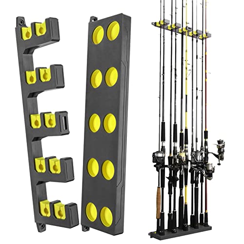 Capacità di archiviazione: la capacità di archiviazione di questo supporto per canne da pesca è una combinazione di 10 canne da pesca o mulinello, la fila interna permette di riporre 5 canne da pesca senza mulinelli, e la fila permette di riporre 5 canne da pesca con mulinelli, di piccole dimensioni ma grande spazio di archiviazione. Risparmia spazio sul pavimento. Perfetto per la conservazione del garage o la sala d'attesa o ovunque.
