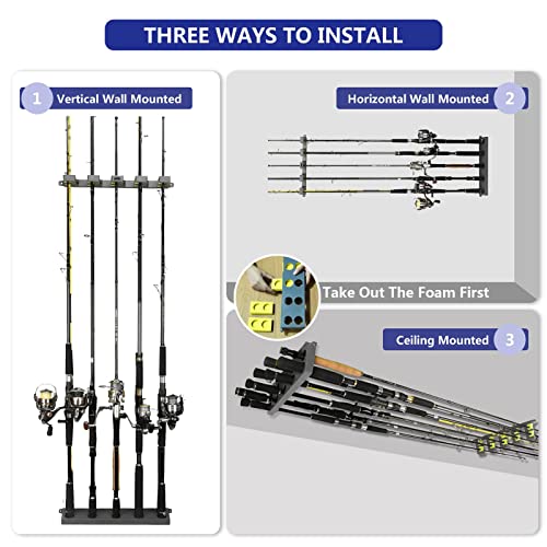 Facile da montare: ci sono tre modi di assemblare il supporto rack per canna da pesci: montaggio a parete verticale, montaggio a parete orizzontale e montaggio a soffitto. L'assemblaggio è un processo senza stress e senza cuciture, quindi è possibile montarlo facilmente con 4 viti. Si prega di notare che per l'installazione orizzontale e soffitto si prega di rimuovere prima la schiuma.