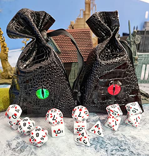 POWER BEAST DUNGEON BORSA DEI DADI DELLÓCCHIO DI DRAGO CON DADI MACCHIATI DI SANGUE - Include una borsa per i dadi o altri oggetti che si desidera conservare, e una fantastica confezione di 7 dadi macchiati di sangue. Sangue che probabilmente proviene da quel Drago che hai cacciato una volta per fare la tua borsa!