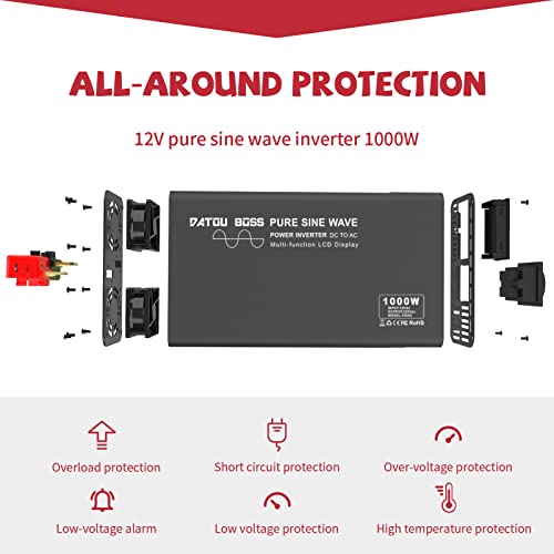 【Inverter 12v 220v Onda Pura 1000W】 Questo inverter di potenza fornisce 1000 watt di vera onda sinusoidale pura da DC 12V a AC 220V-240V di alimentazione continua. Inverter onda pura:alta efficienza, uscita stabile, tecnologia ad alta frequenza, può essere collegato a qualsiasi normale apparecchiatura elettrica senza alcuna interferenza. Soddisfare la domanda di elettricità del 99,99% dei prodotti sul mercato.