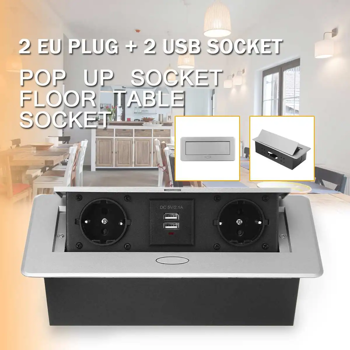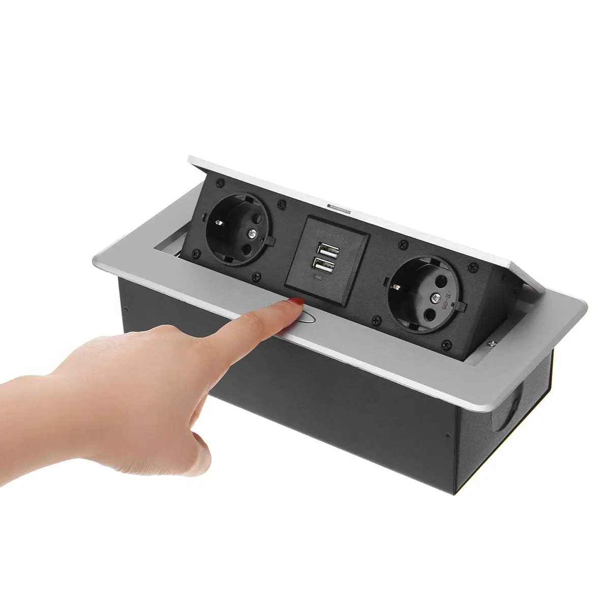 16A 2 Power EU Socket Silver Aluminum Alloy Slow UP Dual USB Charge Port 2.1A Office Table Desktop Outlet Black Steel Box