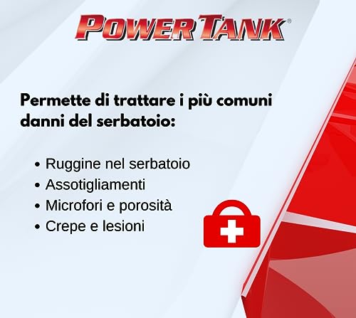 TRATTAMENTO ANTIRUGGINE PER SERBATOI - Il trattamento per serbatoio Power Tank si caratterizza per la sua capacità di sviluppare un rivestimento anticorrosivo permanente inattaccabile da qualsiasi carburante (benzina, gasolio, diesel, olio, miscela) per la rigenerazione interna dei serbatoi. Il Kit PowerTank applicato nel serbatoio, formerà una protezione che eviterà la formazione di nuove particelle di ruggine proteggendo carburatori pompa benzina, filtro benzina e iniettori del vostro motore