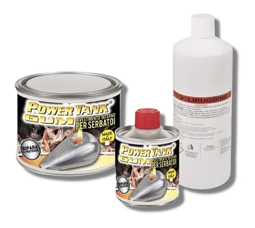 POWER TANK PICCOLO GUM 350 GRAMMI - Trattamento Serbatoio fino a 8/10 litri con elasticizzante e maggiore capacità sigillante. Il kit è composto da un flacone di acido fosfatante togliruggine da 375 ml che elimina la ruggine e incrementa l'adesione, una confezione di Power Tank small Gum da 325 grammi (resina) e una confezione di catalizzatore da 25 grammi. Il kit trattamento serbatoio moto vespa ciclomotore è indicato per tutti i serbatoi in metallo con assottigliamenti, porosita' e microfori.