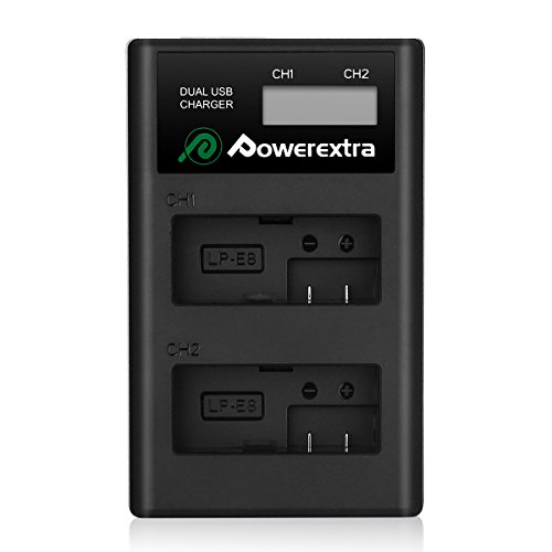 Powerextra Caricabatteria LCD e 2x Batteria LP-E8, Batterie e Doppio Caricatore Rapido per Canon EOS 550D | 600D | 650D | 700D | EOS Rebel T2i | T3i | T4i | T5i | BG-E8 | LC-E8 LC-E8E
