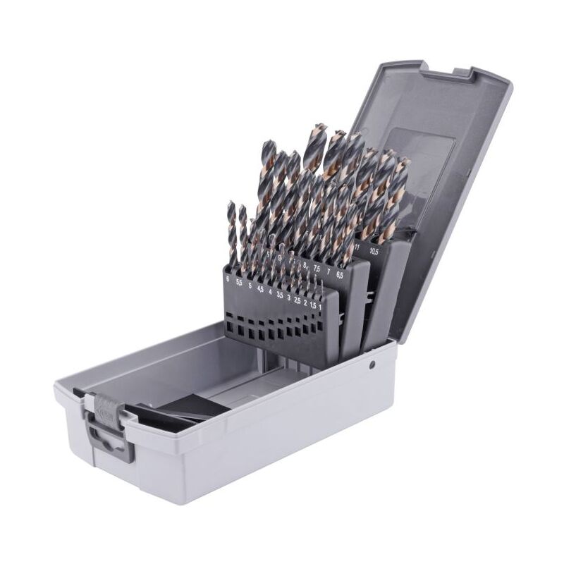 • Trapano a spirale secondo DIN 338 • Taglio croce matura • Albero a tre superfici • Set di perforazione a spirale • Assortimento di perforazione a spirale • Set di perforazione a spirale • Set di perforazione a spirale 25 pezzi • Set di perforazione a spirale 25 pezzi. • 1-10,0 mm A'0,5 mm in aumento • Estremamente Sharp • Nessuna incollaggio • Scatola di plastica • Vita di servizio superiore • Basso Sviluppo del calore • Acciai fino a 900 N / mm2 • Versione a terra