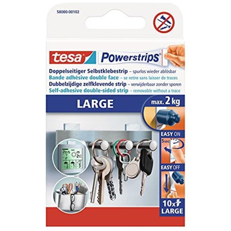 Tesa strisce adesive lunghe e rimovibili, confezione da dieci pezzi. Versatile in casa, al lavoro o in viaggio.