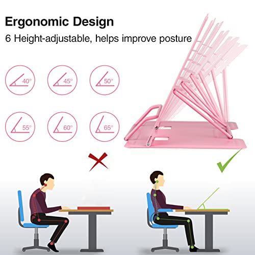 Powmag Leggio in Metallo per Libro, Supporto per Libri in Metallo, Leggio da Tavolo per Libri, Supporto Libri da Studio Portatile Pieghevole ad Angolo Regolabile per Libri Ricette iPad Tablet (Rosa)