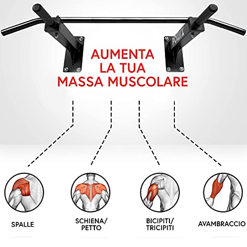 BENEFICI: Con la nostra barra per trazioni potrai AUMENTARE la resistenza e la massa muscolare, DIMAGRIRE grazie al condizionamento a livello metabolico e RAFFORZARE i muscoli della parte superiore del tuo corpo