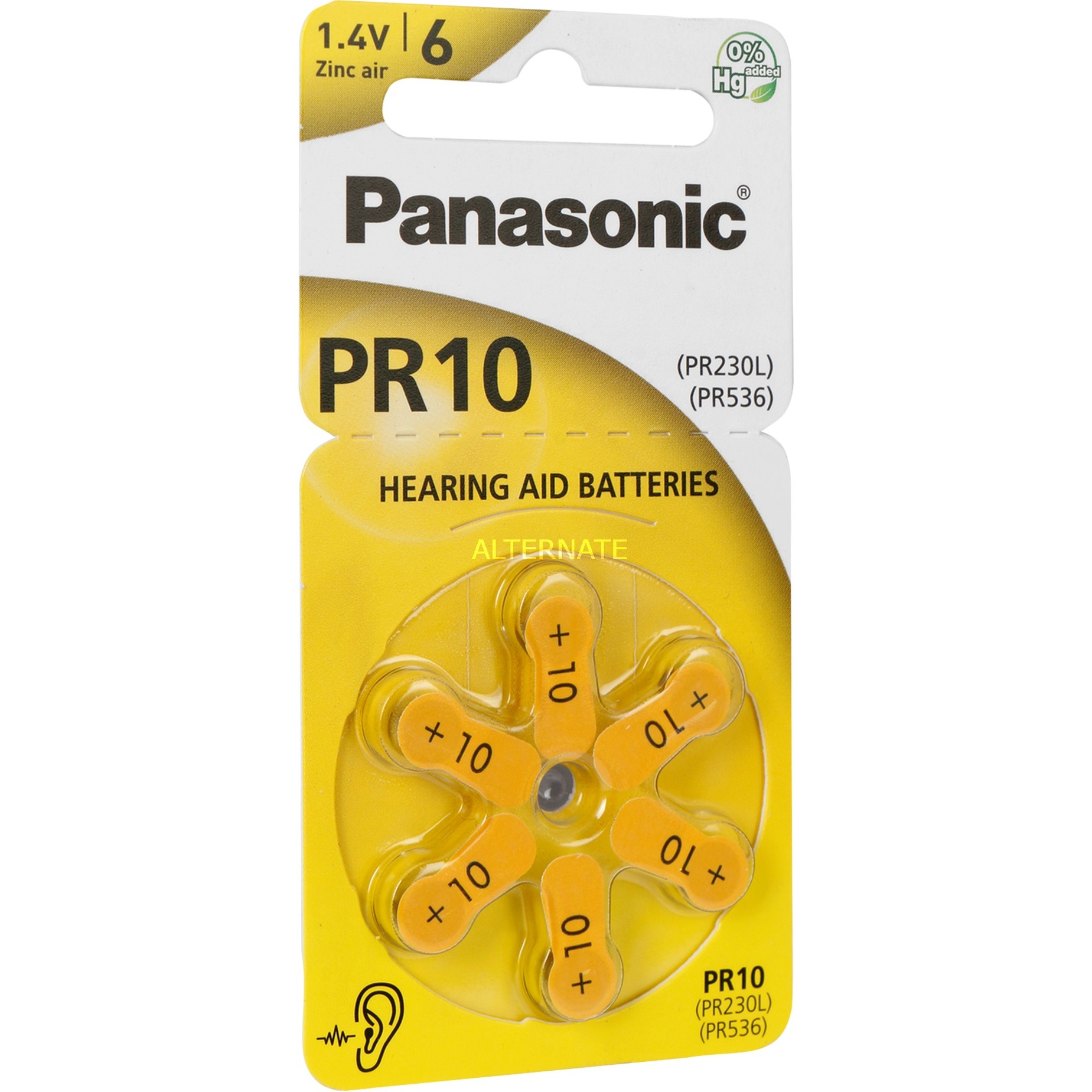 La Panasonic Zinc Air PR-10L/6LB è una batteria per apparecchi acustici di dimensioni 10 che misura 5,8 mm x 3,6 mm. Le batterie sono adatte per apparecchi acustici MiniRITE (ricevitore nell''orecchio) e CIC (condotto uditivo).