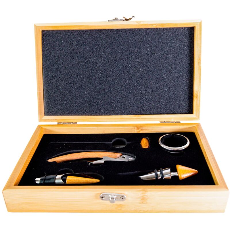Cofanetto da sommelier 5 pezzi: 1 Sommelier, 1 termometro, 1 stop goccia, 1 tappo, 1 tappo versatore. Il tutto in confezione bambù. Dimensioni: 23 x 13 cm.