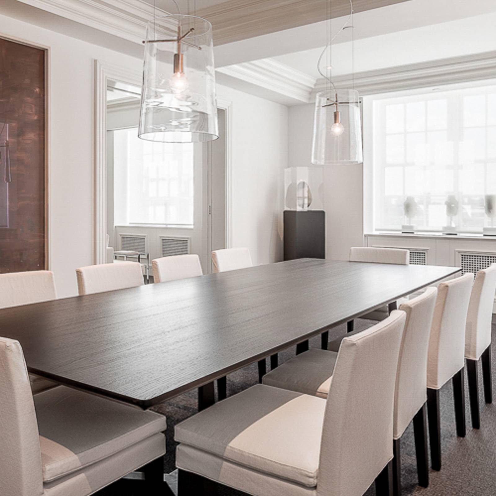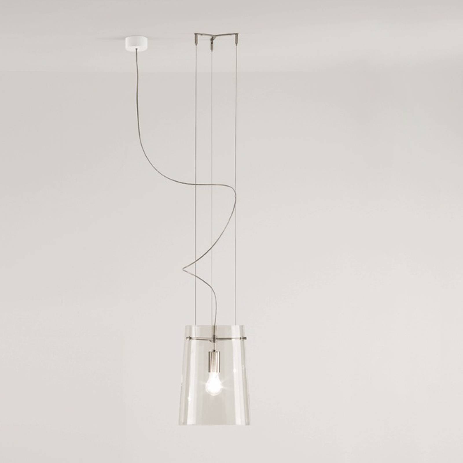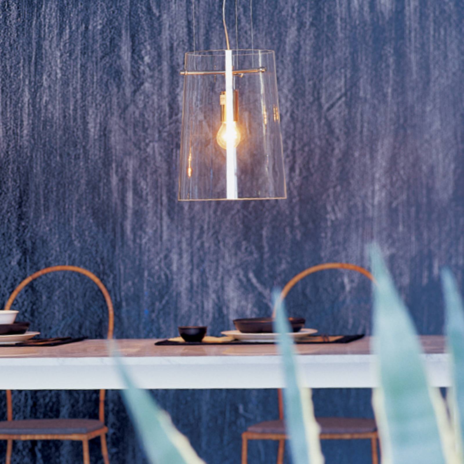 Lampada a sospensione Sera con paralume in vetro chiaro soffiato a bocca e struttura cromata La lampada a sospensione Sera emana una meravigliosa leggerezza e modernità nella stanza con il suo design aperto e trasparente. Il paralume a forma di tronco di cono è composto da vetro chiaro soffiato a bocca. All'interno si trova la presa della lampada E27, la cui guaina è in cromo lucido, così come la struttura metallica. Grazie al vetro trasparente, viene garantita una visione della vita interna, per cui una lampada a filamento E27 (vedi accessori) è un'aggiunta decorativa ideale. La sospensione a tre corde con baldacchino separato completa elegantemente il design. L'apparecchio offre una luce diretta e fa una buona figura soprattutto sopra un tavolo o un bancone. Sera è un prodotto dell'azienda Prandina, fondata nel 1982 da Sergio Prandina. I prodotti del produttore italiano di lampade hanno un alto valore di riconoscimento, che spesso deriva dai paralumi in vetro soffiato a bocca dal design unico. In collaborazione con noti architetti e designer d'interni, vengono creati apparecchi che vengono utilizzati, ad esempio, in catene alberghiere internazionali come Hilton, Marriott, Radisson.