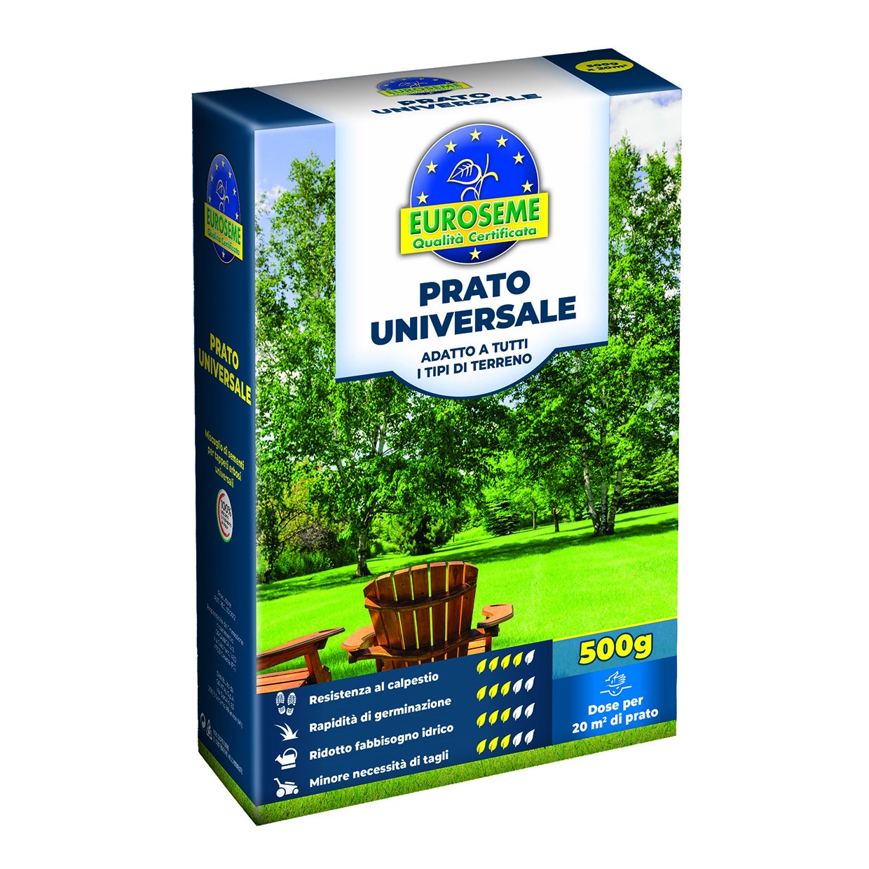 Miscuglio di erbe graminacee. Ideale per giardini, aree gioco e di passaggio. Adatto a tutti i tipi di terreno, ideale per il classico giardino italiano. Resistente al calpestio. Cresce rapidamente.
