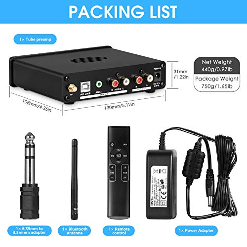 Può essere utilizzato come preamplificatore tubo, collegato tra source audio e amplificatori o altoparlanti attivi per migliorare la qualità del suono. Può essere utilizzato come amplificatore per cuffie, chip MC33078, supporta cuffie da 16 - 64 Ω, comodo per ascoltare musica da soli o da notte. Può essere utilizzato come USB DAC, supporta la velocità di campionamento 24 bit/192 kHz per fornire un suono di alta qualità e bassa distorsione, non è necessario per qualsiasi driver, plug e play.