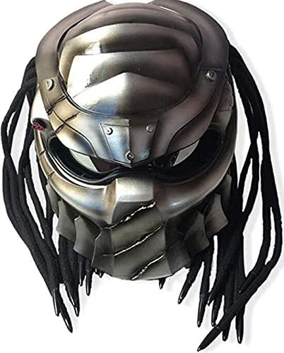 Elmo da predatore con luce, Casco integrale da motociclista per casco da guerriero in ferro nero con lenti creative antiappannamento per capelli a treccia con luce a LED Certificati D.O.T (XL)