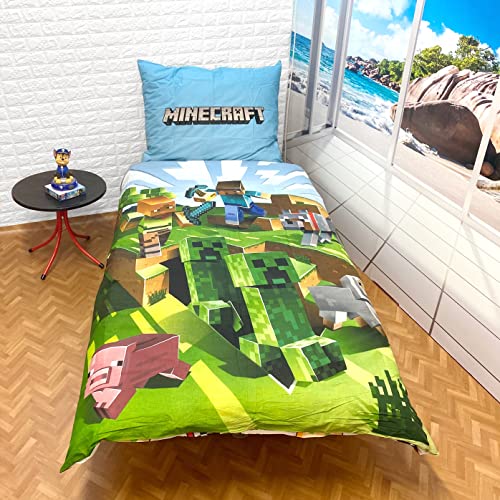 L.T.Preferita Mondo Green Blocks Craft Battle 3pezzi Set Letto Singolo Copripiumino 140x200 cm + Federa + Lenzuola con Angoli