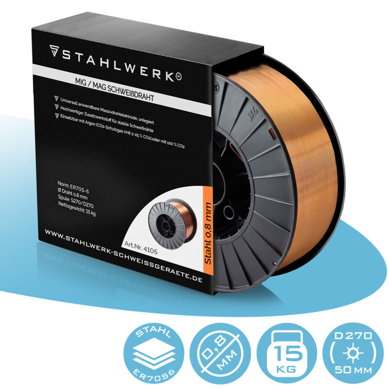 STAHLWERK MIG MAG premium filo per saldatura ER70S-6 SG2 0,8 mm 15 kg bobina di filo Filo per saldatura MIG MAG premium STAHLWERK ER70S-6 SG2 0,8 mm applicabile universalmente su bobina da 15 kg con supporto da 50 mm. Materiale d'apporto di alta qualità per cordoni di saldatura stabili. Caratteristiche Filo per saldatura SG2 di alta qualità da 0,8 mm per dispositivi MIG MAG con porta bobina da 50 mm. Elettrodo a filo pieno universale, non legato. Materiale d'apporto di alta qualità per cordoni di saldatura stabili. Può essere utilizzato con gas di protezione argon / CO2 con il 2-25% di CO2 o con il 100% di CO2. Composizione chimica migliorata per risultati di saldatura ancora migliori. Bassi spruzzi grazie all'elevata purezza chimica per risultati di saldatura ottimali. Materiale d'apporto di alta qualità per cordoni di saldatura stabili. Standard: ER70S-6 Diametro bobina: S270/D270 Contenuto della fornitura 1 x STAHLWERK MIG MAG premium filo per saldatura ER70S-6 SG2 0,8 mm S270/D270