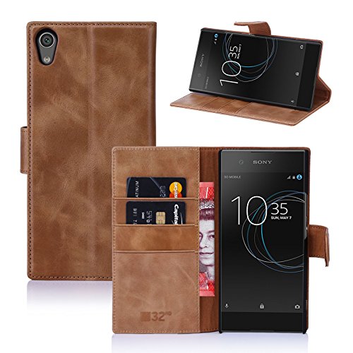 32nd Premium Series - Custodia a Portafoglio in Pelle Premium Vera per Sony Xperia XA1, Case Realizzato in Pelle Premium con Diversi Comparti, Chiusura Magnetica e Supporto integrato - Castagna
