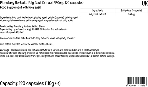 PremiumVital Planetary Herbals Holy Basil Extract (estratto di basilico santo), 450mg, 120 capsule, con pratico portapillole, Testato in Laboratorio, Senza Glutine, Senza Soia
