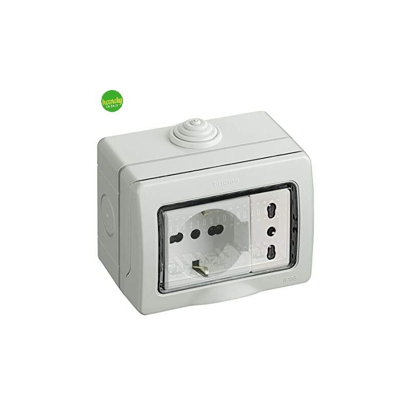 Dalla linea dedicata alla serie civile MATIX a marchio Bticino, la cassetta da esterno ha già al suo interno una presa bipasso da 10 / 16 A e presa schuko bipasso appartenenti alla linea MATIX Bticino, i comandi sono già fissati nell'alloggio frontale della cassetta ed hanno bisogno soltanto di essere cablati. Fondamentale per la realizzazione di impianti elettrici esterni senza dover eseguire lavori murali, lo sportello stagno frontale offre una protezione pari ad IP55 che ne garantisce una totale resistenza alle intemperie. La presa inoltre è dotata di sistema di blocco di sicurezza dei poli se si provi ad inserire qualsiasi cosa che non sia una spina idonea alla presa.