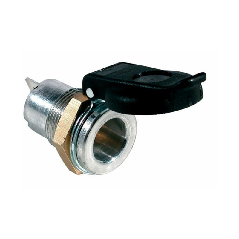 Presa bipolare da 12-24 V in metallo con cappuccio rigido. Composta da: corpo in ottone placcato nichel, 2 contatti da 6,3 mm e diametro del foro per l'applicazione 18,5 mm.