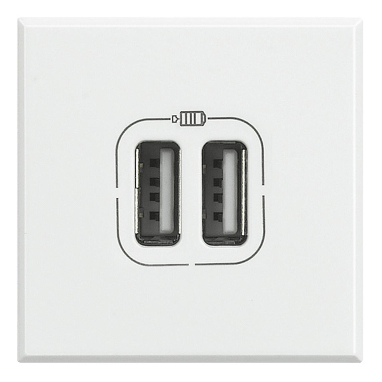 Con tensione 5 Vd.c, 2 moduli. Adatta per per ricarica rapida di un singolo dispositivo elettronicofino a 2400 ma o ricarica contemporanea di due dispositivi fino a 1200ma