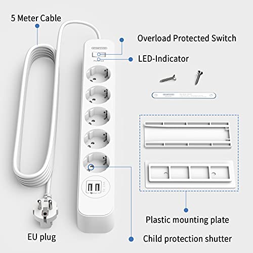 【5 prese AC Ciabatta con 2 USB e montaggio a muro】La Ciabatta ha 5 prese AC con 2 USB adatte all'uso simultaneo di diversi elettrodomestici per casa. La presa è standard Europea, adatta per la maggior parte dei paesi Europei. La ciabatta è fornita di un supporto per montaggio diviso in due parti. Una parte si attacca al muro, l'altra si attacca alla ciabatta. Poi devi solo incollare le due parti insieme.