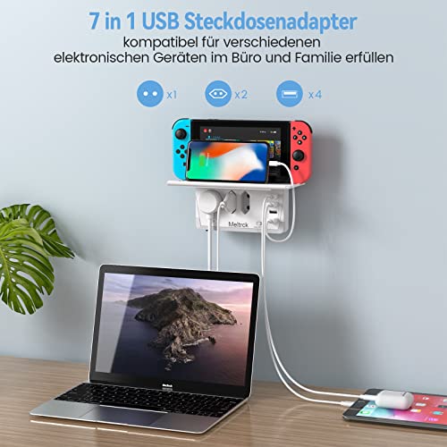Presa Multipla Salvaspazio,Meltrck Adattatore spina tedesca multipresa da Parete,3 Posti 1 Schuko + 2 presa AC + 4 Porte USB,Perfetto per Ufficio, Casa o Viaggio 10A 2400W