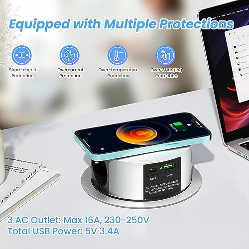 ✅ Presa da tavolo retrattile a 3 vie - La presa pop-up a 3 vie ha funzioni di ricarica wireless da 10 W compatibili con tutti i dispositivi conformi allo standard Qi.