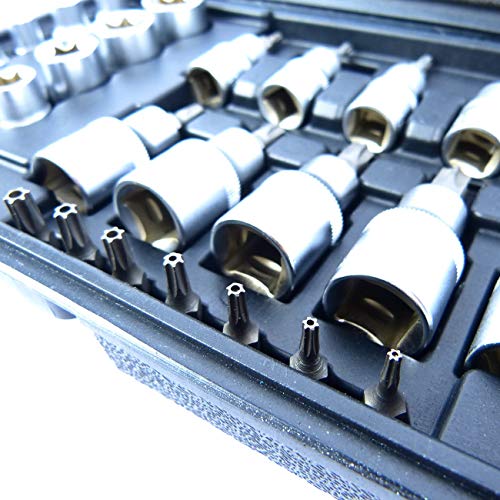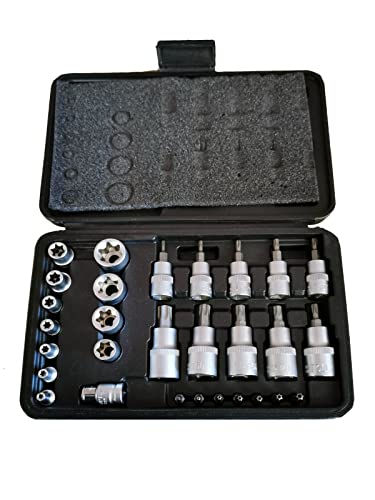 Set completo di punte e prese a stella in un'ampia gamma di dimensioni. Ogni kit contiene prese Torx a stella da 1/4" E4, E5, E6, E7, E8. Prese Dr 3/8": E10, E12, E14, E16, E18, E20. Prese Dr 3/8": T10, T15, T20, T25, T27. Prese Dr 1/2": T30, T40, T45, T50, T55. Punte Dr 1/4": TT8, TT10, TT15, TT20, TT25, TT27, TT30. 1 x Dr 3/8" incluso