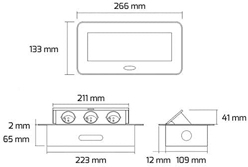 Dimensioni: copertura 266 x 133 mm, scatola da incasso 223 x 109 mm, profondità di montaggio 65 mm, pannello frontale 2 mm