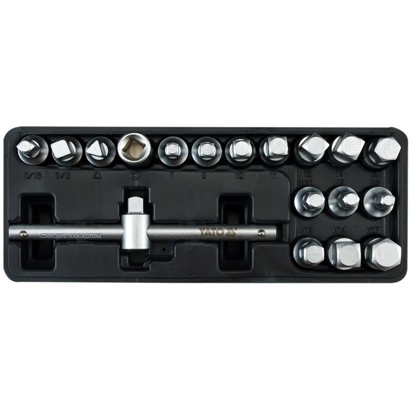 Descrizione:Chiave per tappo olio, set da 18 pezziDati tecnici:- Numero indice YT-0599- Marca Yato- Unità KPL- Peso lordo (kg) 1.2500- Numero di elementi 18- Dimensioni [mm] 5/16"-3/8", 8.10, 7-14, 10, 8-17- Dimensioni trasmissione [pollici] 3/8"