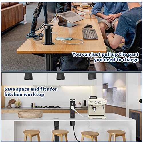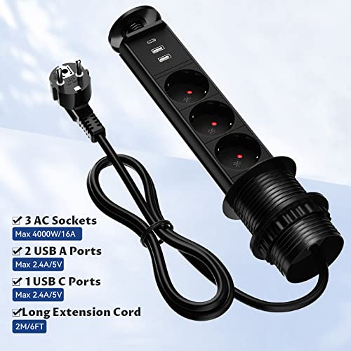 3 prese da tavolo a scomparsa con USB C, presa a scomparsa da cucina con 2 USB A, presa da incasso a scomparsa, colore nero, presa a scomparsa per piano di lavoro, 4000 W/16 A, cavo da 1,8 m