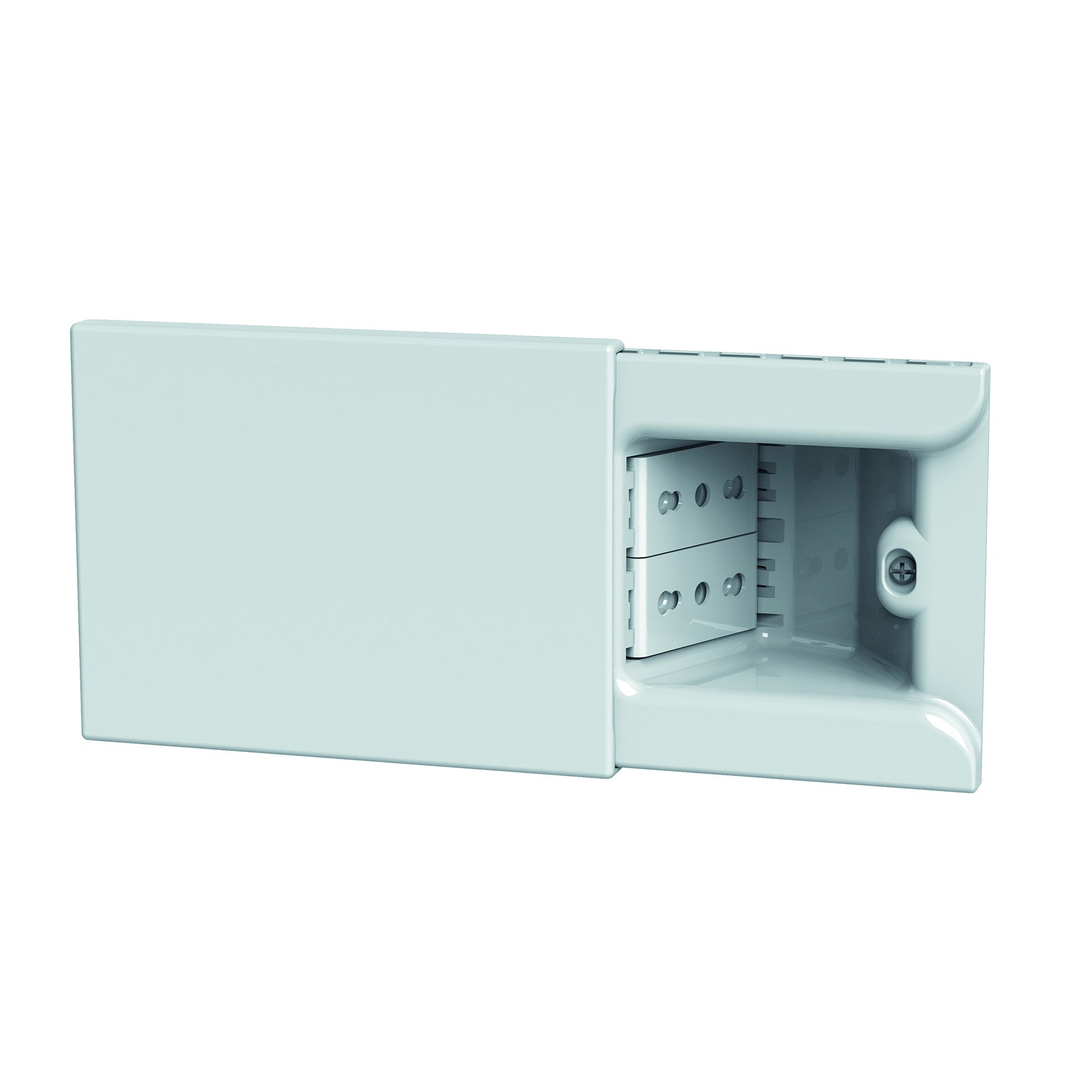Verniciabile, 3 moduli - a scomparsa.n 2 prese 10/16A. Completo di sportello scorrevole che permette di nascondere le prese anche con cavi inseriti. Si installa direttamente nella scatola 503 e non necessita di supporto