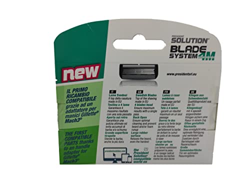 Le lamette da barba President Solution sono compatibili con tutti i manici Gillette Mach3. Grazie ad un brevetto mondiale si adattano al manico con un connettore collegato ad ogni lama mantenendo pari lunghezza e inclinazione dell'originale