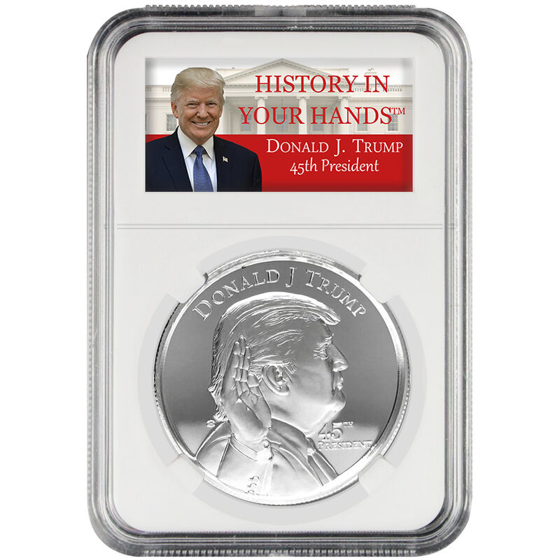 L'obverse presenta il profilo del presidente Trump, mano destra nell'aria che cattura il momento in cui ha lavorato in ufficio. Le scritte leggono, "Donald J Trump" e "45th President." La casa bianca è dipinta sul retro, insieme alle scritte, "The White House" e "1 oz 999 AG."Moneta Replica, realizzata con anima in ferro.Ogni moneta è confezionata in una scatola di plastica quadrata professionale.